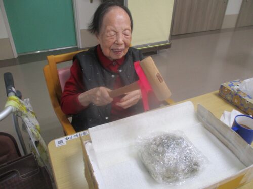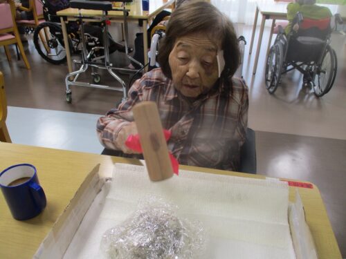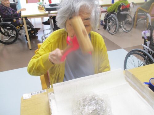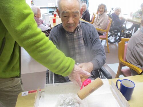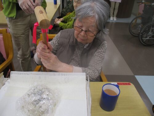 女性職員がした時には上手につくことができずやり直しを行いました。それを見ていたご入居者様は笑っておられました。
