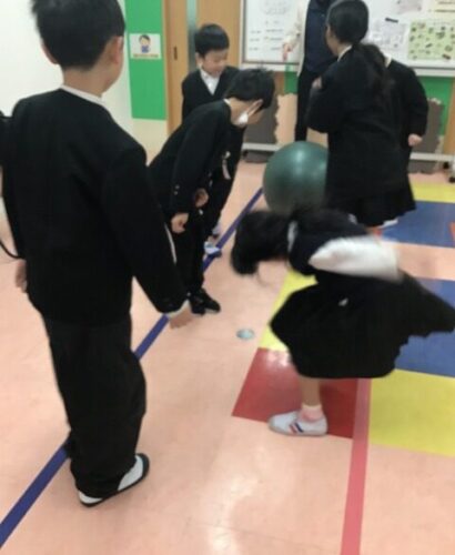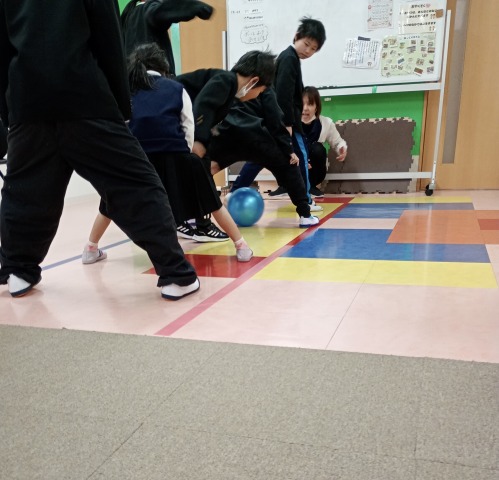 みんなで一列に並んで、前から転がってくるボールにあたらないようにするよ‼️