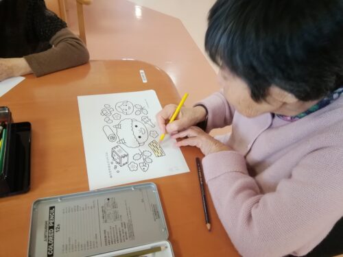 季節を感じられる絵柄にて皆さまの思い思いの色を選びながら取り組まれておりました。