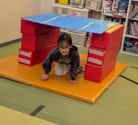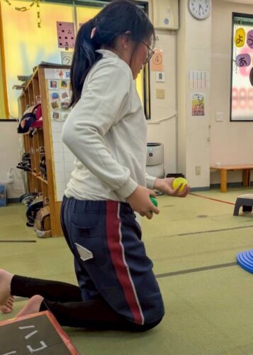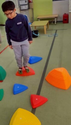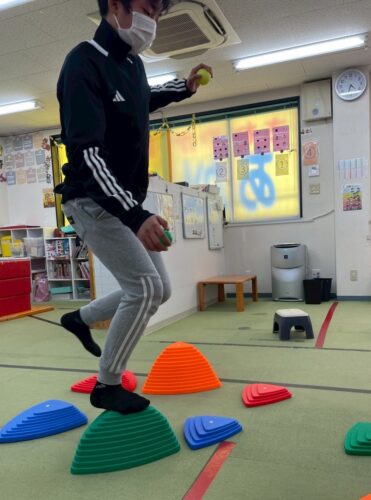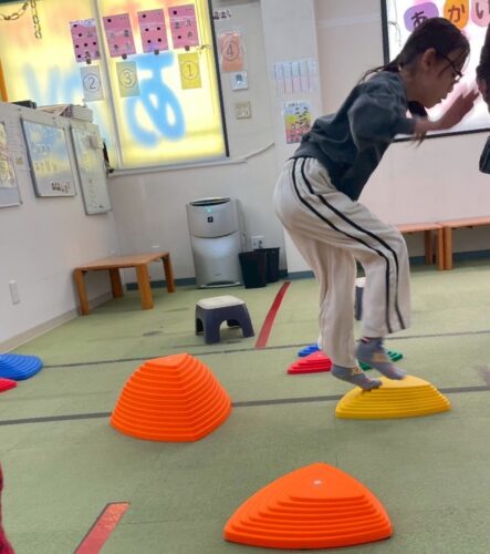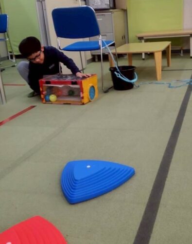 箱から取ったボール2個と同じ色の飛び石のみ渡ってゴールします。 よく考えながらゴールを目指しました。