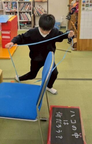 輪にさわらず、ひもだけ動かしてバケツに入れました。