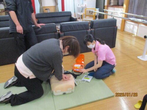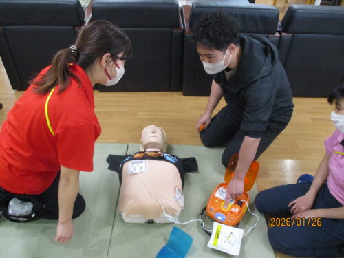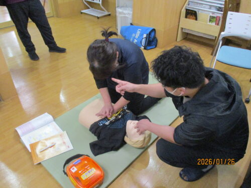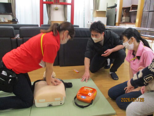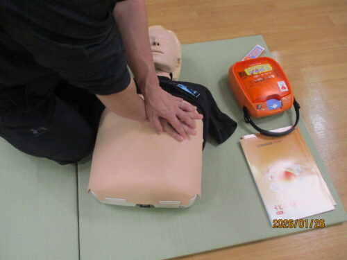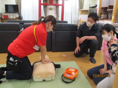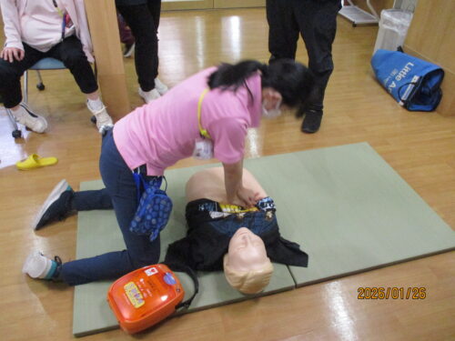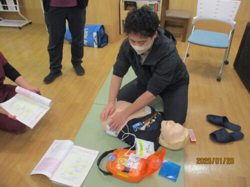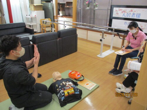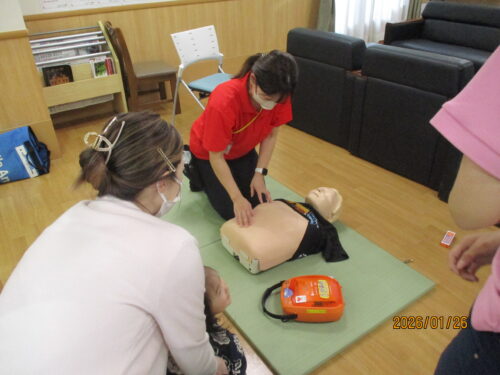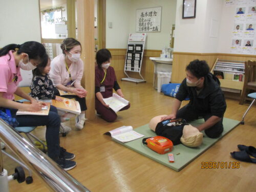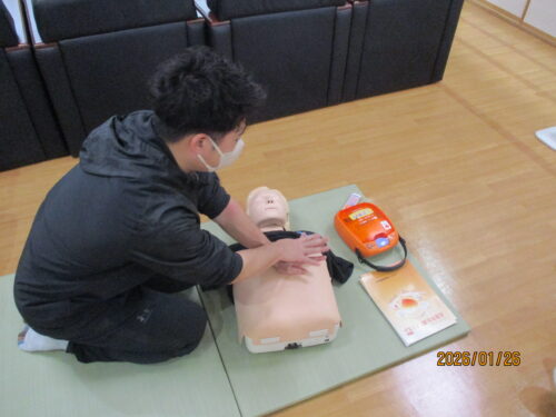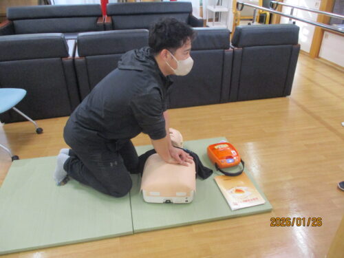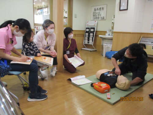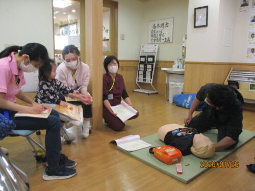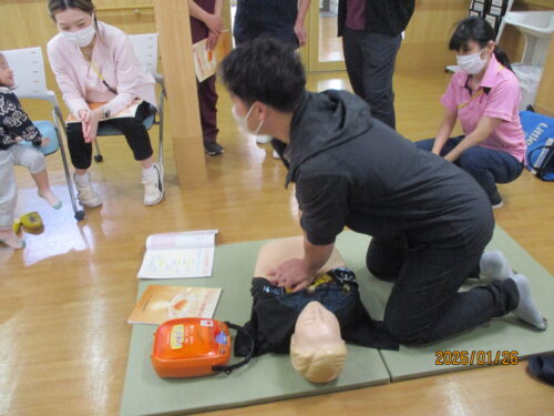 現消防署員さんが、指導に来てくれました。田中職員のご主人です。
