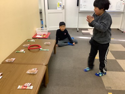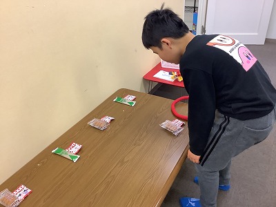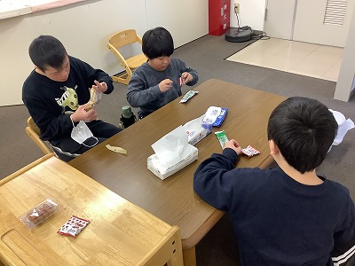 一投ごとに歓声が上がり、見事お菓子をゲットできると「やったー!」と大喜び! 自分で手に入れたお菓子の味は、格別だったようです。 みんなで机を囲んで、ニコニコ笑顔の楽しいおやつタイムになりました。