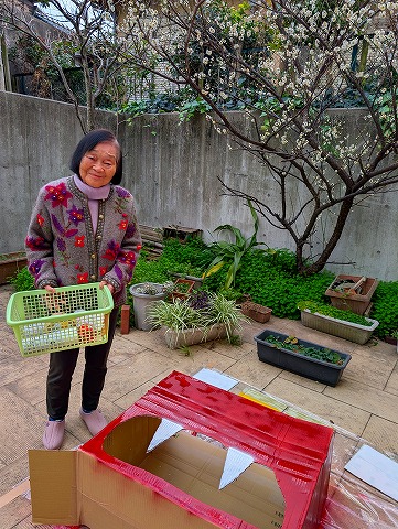 小さな段ボールのパーツは、入居者様がスプレーで色塗りをして頂きましたよ!!