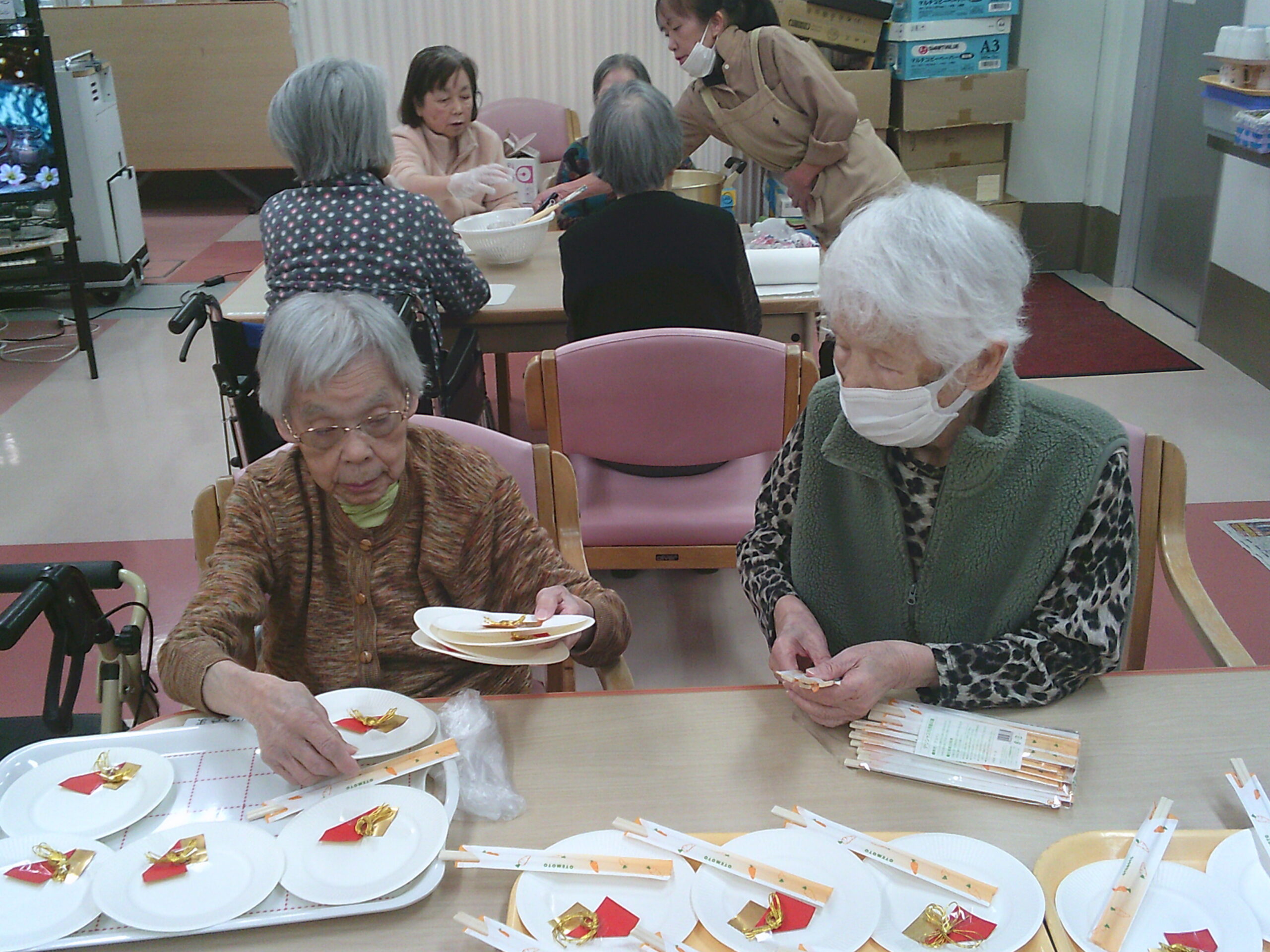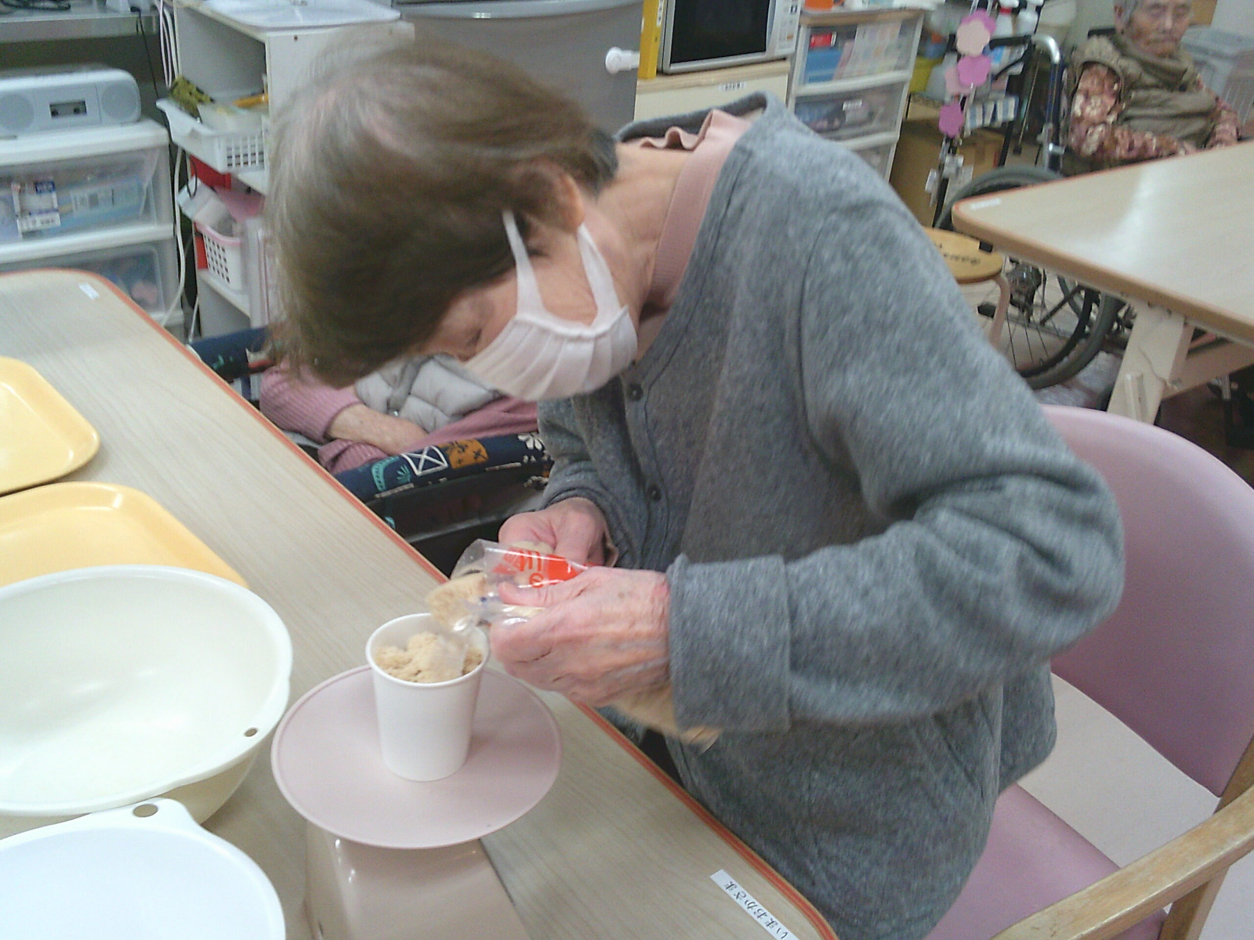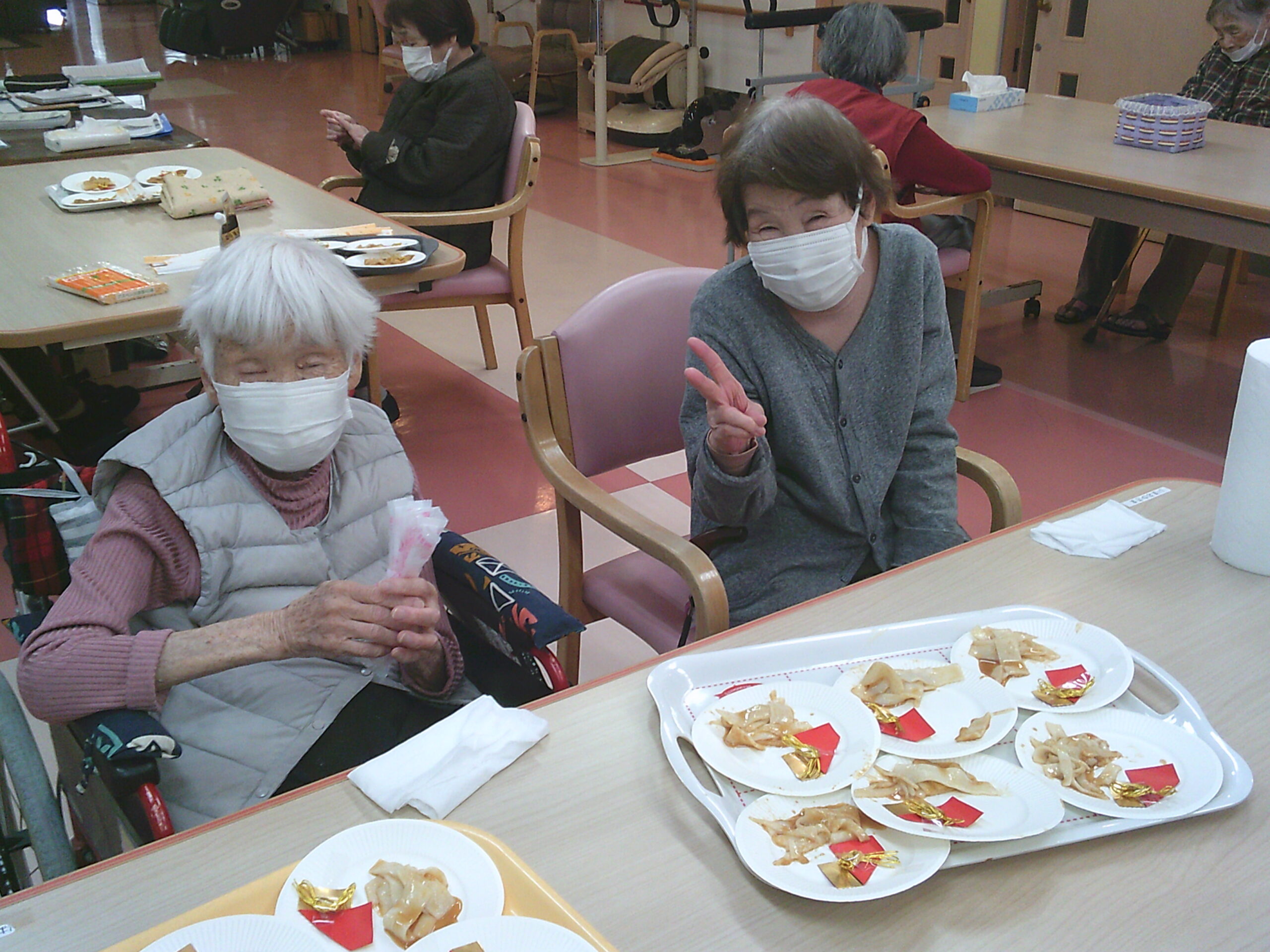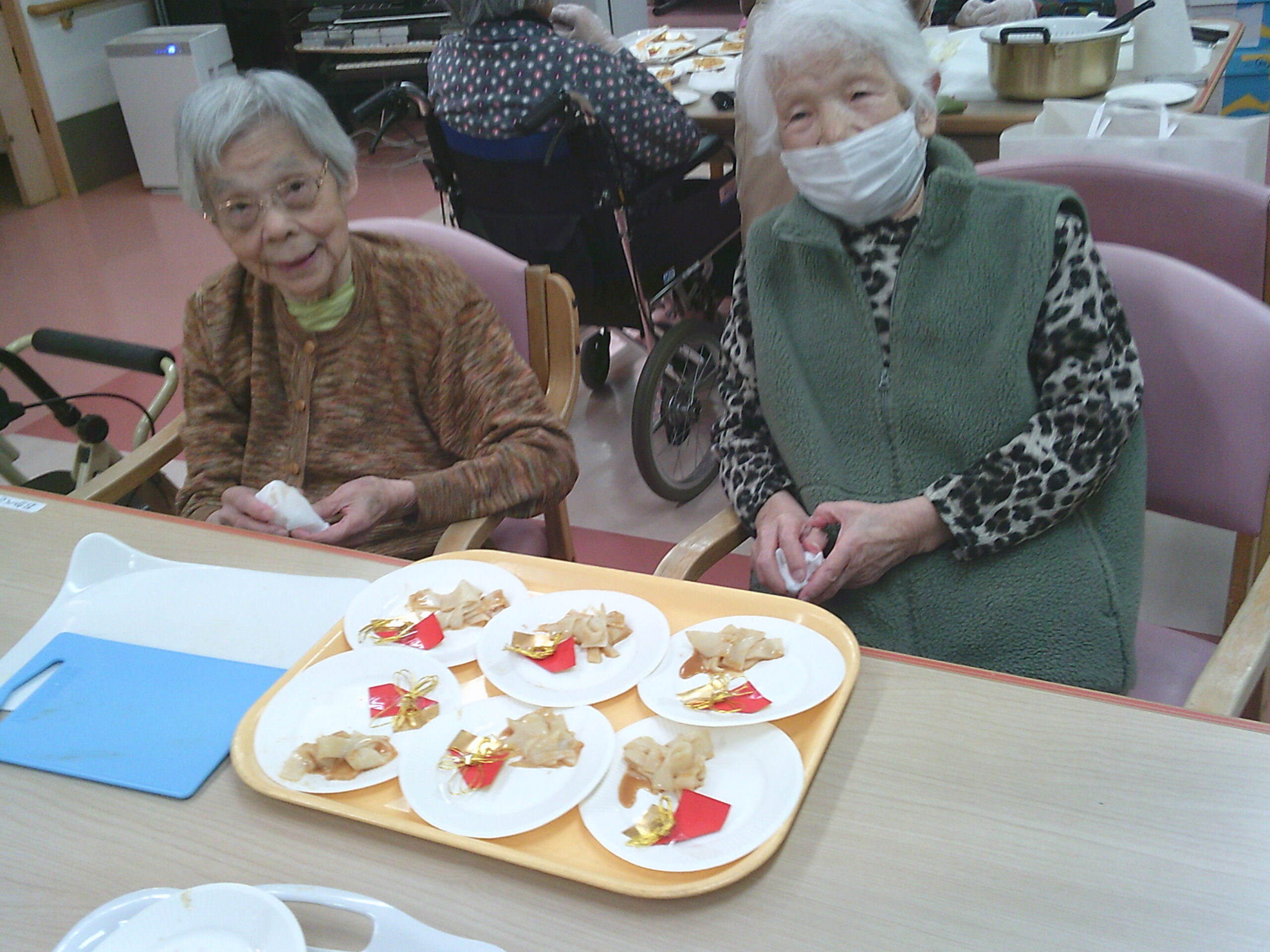 さわやか花美館 料理レク 2026-02-02 2026-01-28 料理レクを行い、大分県の郷土料理のお菓子でやせうまを作りました!! 砂糖ときな粉の分量を計ってくれてます こちらは計り終えたきな粉、砂糖をまぜまぜ(笑) そして、飾りつけしたお皿を並べていく作業 チームワークばっちりでお手伝いをしてくれました すみません!! 職員も一緒に作業に夢中で盛りつけの写真を忘れてしまいました(´;ω;`) 皆さん頑張ってくれて完成したやせうまとハイポーズ!! おいしく出来上がり大成功!