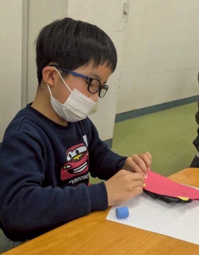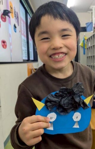 考えながらパーツを貼っていきました。 丸めた黒い紙を貼り、眉や口を描いて完成👹 強そうだったり、優しそうだったり、