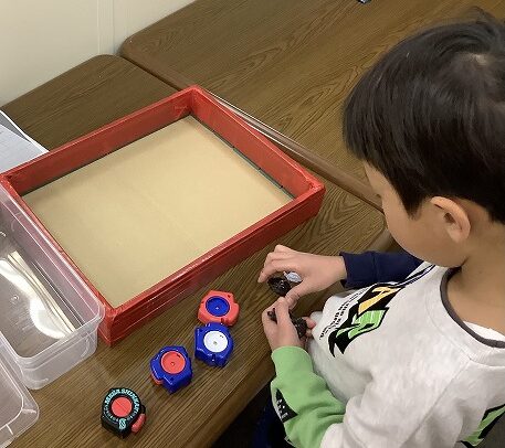 活動の合間の自由時間には、大人気のベイブレードで盛り上がりました。 自分でカスタマイズしたコマを手に、「3、2、1、ゴー、シュート!」の掛け声が響きます。職員と対戦したり、回る様子をじっくり観察したりと、思い思いに楽しむ姿が見られました。
