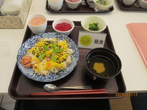 ↓ちらし寿司・菜の花のからし和え・茶碗蒸し蟹あんかけ