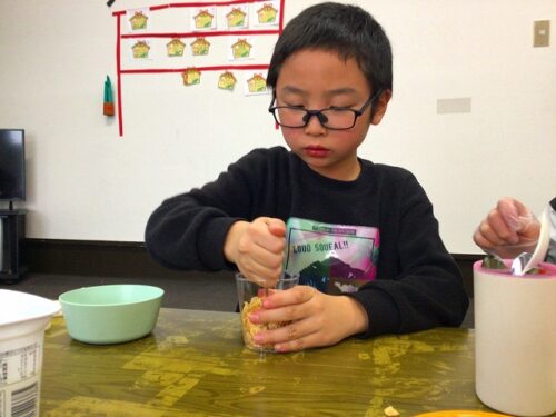 「パフェを作るよ」と伝えた瞬間から、子どもたちは大喜び 。