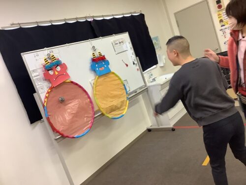 ホワイトボードに現れたのは、真っ赤な顔の**「怒りんぼ鬼」と、涙を浮かべた「泣き虫鬼」**。 子どもたちは、自分の心の中にいそうな鬼をどちらか選んで、新聞紙で作った「豆」を力いっぱい投げます!