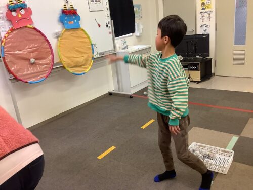 みんなそれぞれに目標を決めて、真剣な表情でボールを投げていました。 ラインから外れないように足元に気をつけたり、全身を使って投げたりと、楽しみながらも集中力や身体の使い方のトレーニングにもなっています。