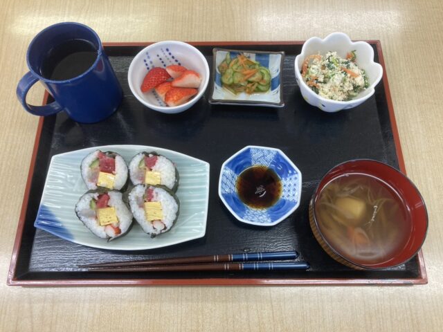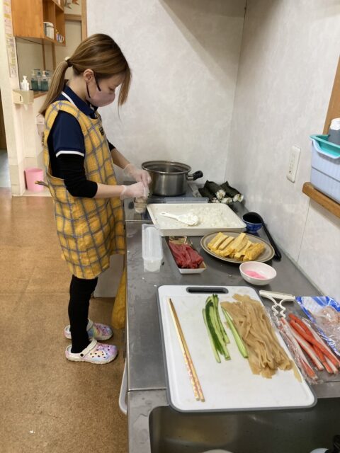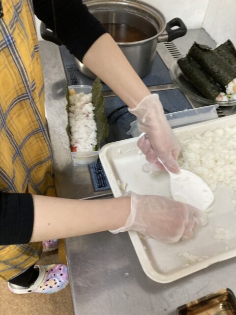 今日は節分祭を行いました。まずは恵方巻  もちろん手作りですよ^^