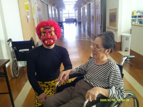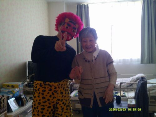 初めは、急に鬼がやってきたので入居者様も驚いておりましたが、