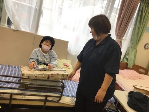 最後に、余暇時間には、皆さん好きなことをされますが、こうやって職員とわいあいあい、いい顔で何かお話ししていますよ😊