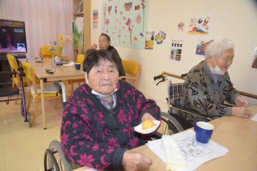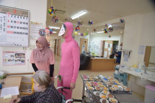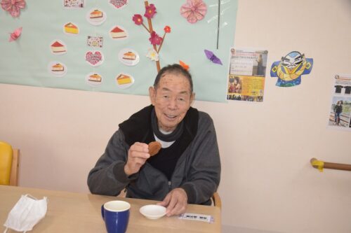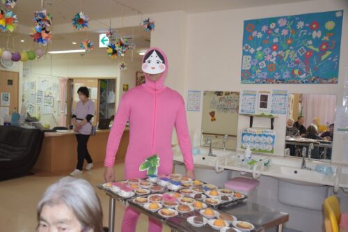 さわやかかぬま館 節分おやつ【さわやかかぬま館】 2026-02-08 2026-02-04 節分おやつ! 3時のおやつは福の神に扮した秋岡施設長がおやつを運んでくれました! ピンクの衣装に福の神のお面をつけて、 「皆様の健康を願います」と笑顔で乾杯しました! 担当☆木主
