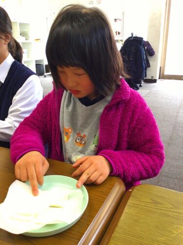 お友だち同士で「これ使っていいよ」と声をかけ合いながら、仲良く具材を分け合う姿がとても微笑ましかったです。