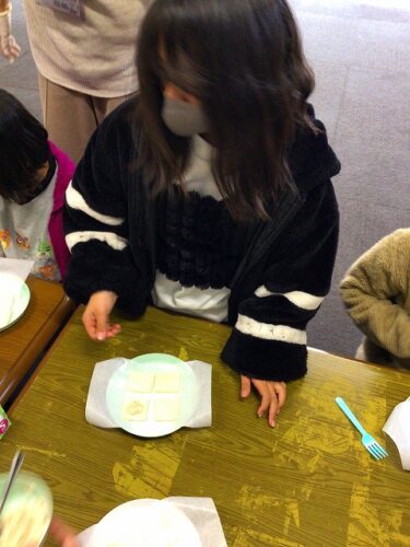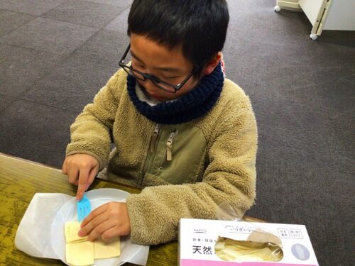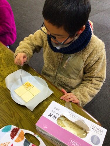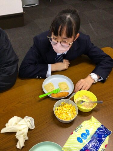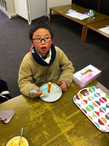 出来上がったパイを食べながら感想を聞くと、「コーンがおいしかった!」という声がたくさん。 甘くてプチッとした食感が、子どもたちのお気に入りだったようです。