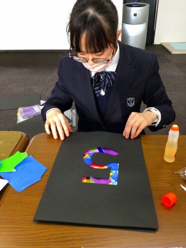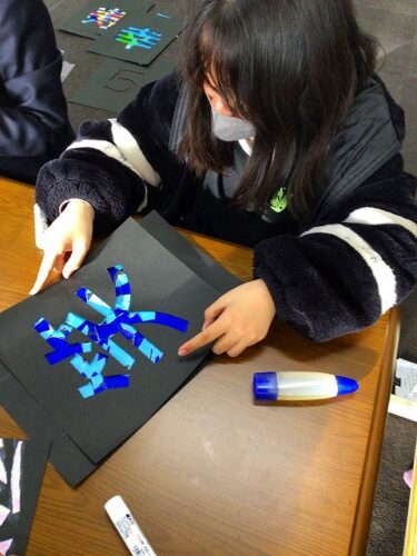 画用紙一面に貼り終えた後、形に切り抜いた黒色の画用紙を選び、二枚重ねることで、数字や字がカラフルに浮かび上がる作品を完成させました。