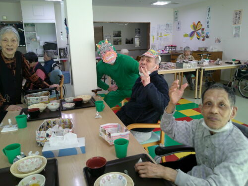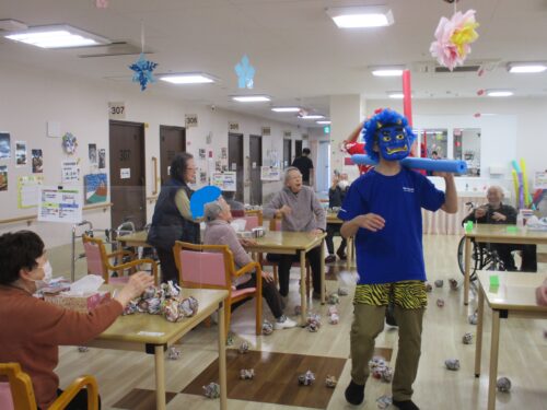 紙を丸めて豆まきを