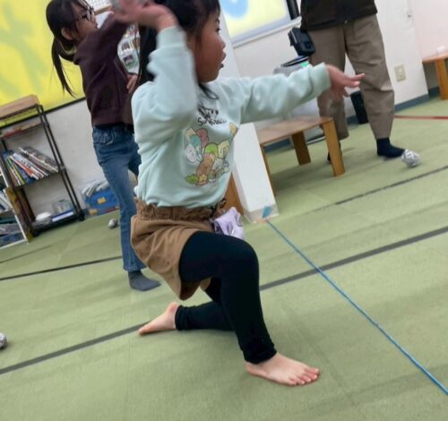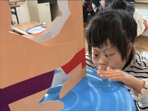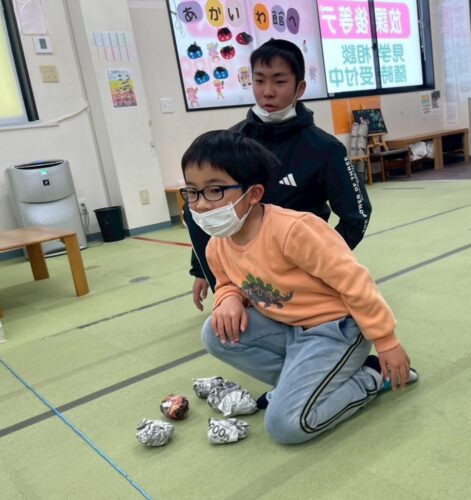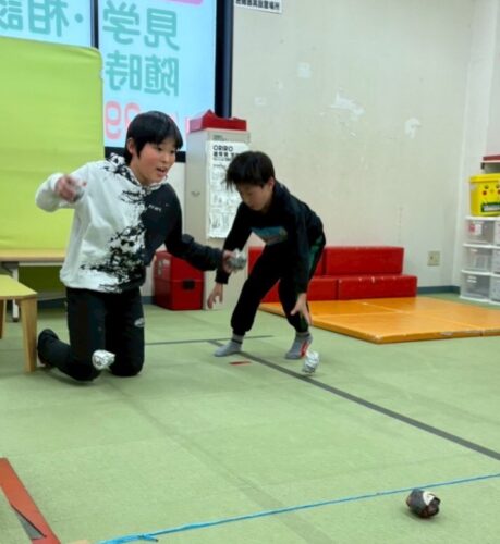 2人1組でチームを組み、相手チームと新聞紙の豆を1分間投げ合います。