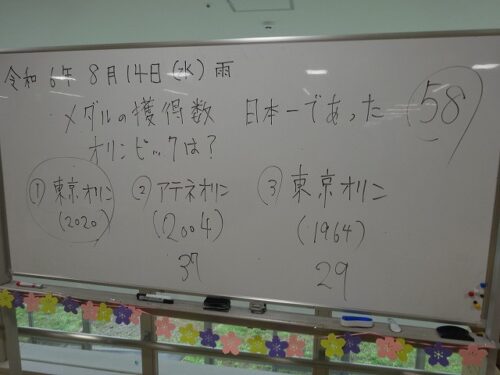 さわやか室蘭弐番館 2階 14日活力朝礼♪ 2024-08-15 2024-08-15 皆様こんにちは♪ 昨日の様子をお届けします 日付の確認後はラジオ体操です 最後は大きく深呼吸です 頭の体操は閉会したパリオリンピックにちなみ 3択問題です