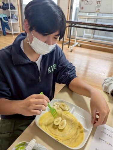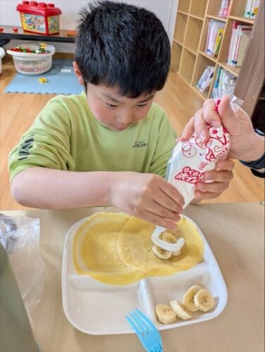 出来上がったクレープの生地にバナナ🍌や生クリームをのせて自分たちで包み、おやつの時間に食べました😋✨