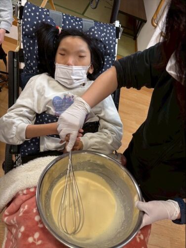 だまがなくなるまで混ぜたら生地を冷蔵庫でねかし、焼く作業は職員が行いました!