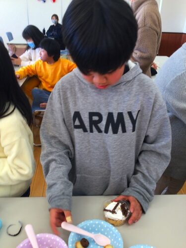 絞り袋をぎゅっと握りしめ、真剣な表情で模様を描く姿は、まるで小さなパティシエ。