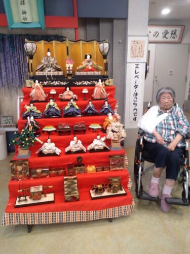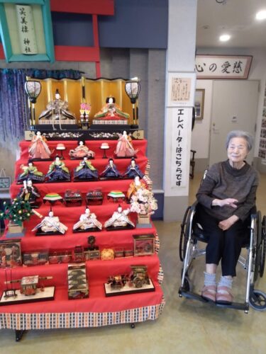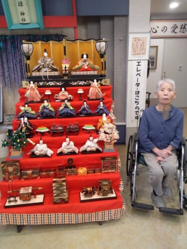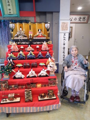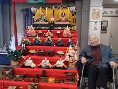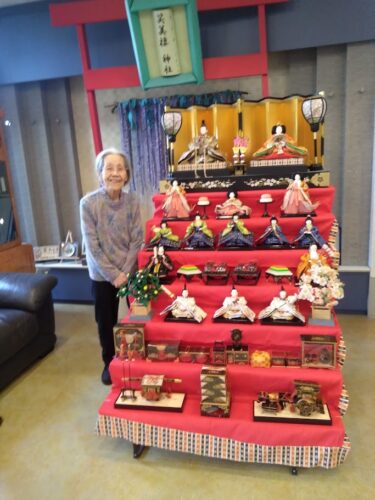 今年も1Fエントランスホールにて入居者様と一緒に雛人形の飾り付けを行いました。