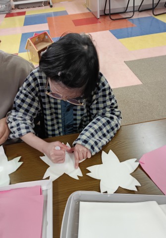 ピンクや白、黄色の柔らかいはな紙を、指先を使って小さく丸めていきます😀この「丸める」作業が、指先のいい運動になりますね🖐️