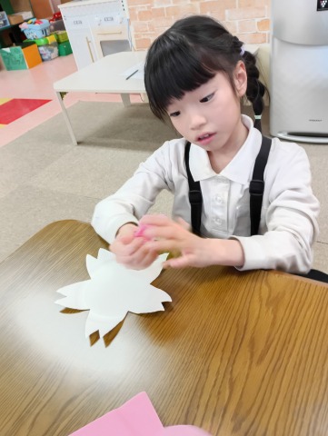花びらの形にカットされた白い紙皿に、のりを丁寧に塗っていきます😀