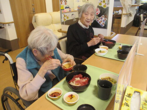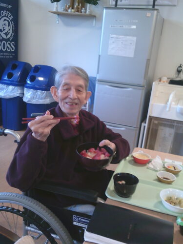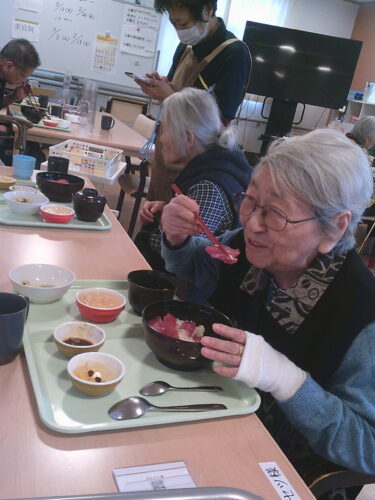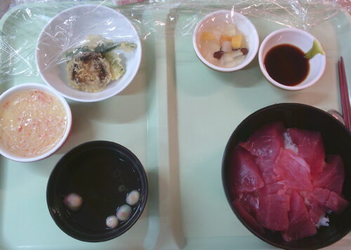 今日のメニューは鉄火丼、蟹あんかけ茶わん蒸し、天ぷら、みつ豆です😊