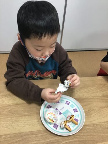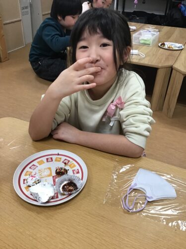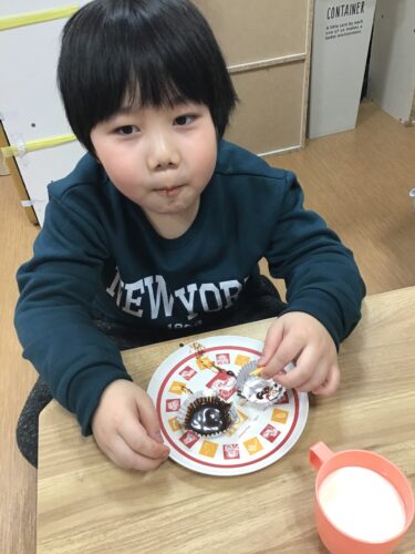 お口のまわりにチョコをつけながら、焼きたて・作りたての味を堪能していました。😋