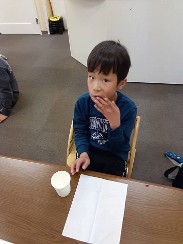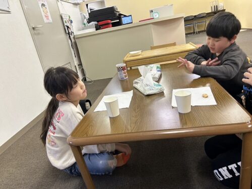 メニューは、備蓄の定番**「カンパン」と「お水」**。 普段とは違う雰囲気に、子どもたちも少し緊張感を持って参加してくれました。