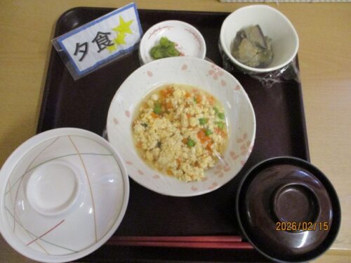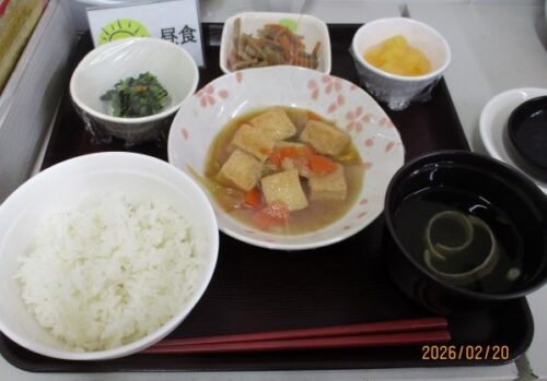 ↓厚揚げの五目炒め 金平牛蒡 春菊の和え物
