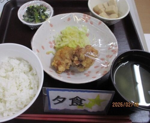 ↓鶏竜田揚げ 高野豆腐の煮物 青梗菜のおかか和え