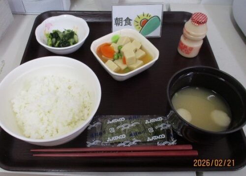 ↓朝食:高野豆腐の含め煮 青梗菜のポン酢和え 味付け海苔