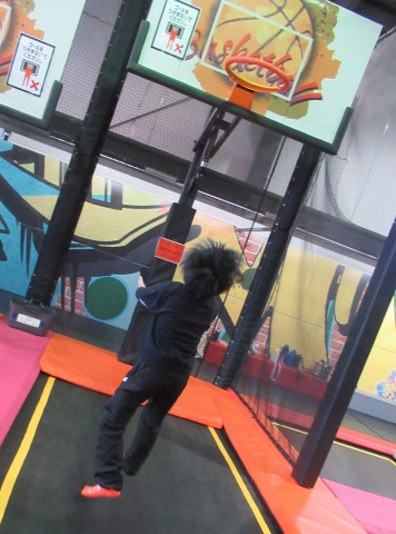 バスケットボールコーナーでは、床のトランポリンで跳ねつつ