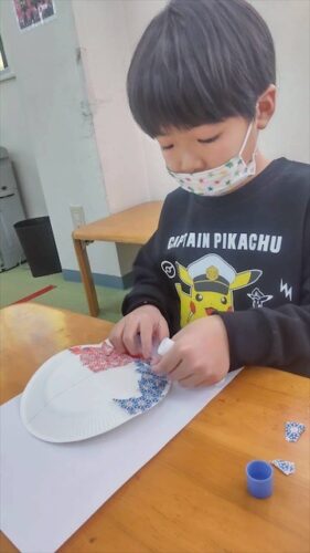 色々な柄の赤系、青系の折り紙を選んでちぎって貼ります。