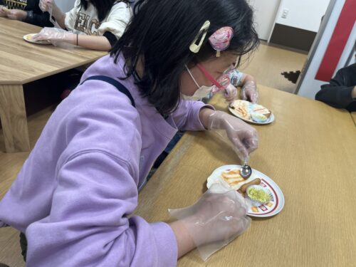 次は、職員が塩コショウをして炒めておいたキャベツをトルティーヤに