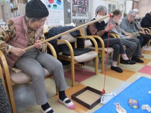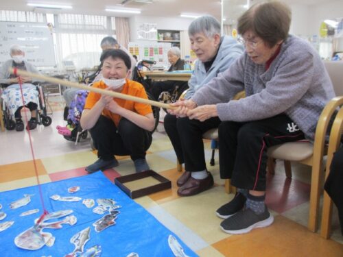 集団レクリエーションで行った「魚釣りゲーム」を、