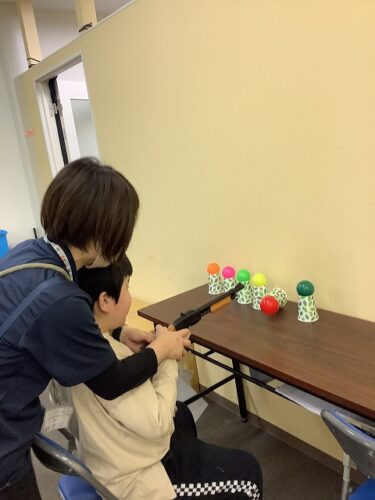 最初は「難しいかな?」と不安そうにしていた子も、スタッフと一緒に銃を構えて練習するうちに、コツを掴んでいきました。 パコン!とボールが綺麗に飛んでいくと、室内にはパッと明るい笑顔が広がります。
