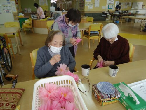 さわやか室蘭館 3F桜の花びら作成中🌸 2026-02-27 2026-02-27 皆様こんにちは! 本日は、3Fフロアの飾り制作の様子をご紹介します(*'ω'*) 大きな桜の花びらがいっぱいですよ~🌸🌸🌸 「開くのがなかなか難しいよ~」と苦戦されておりました💦 「楽しいよ」とニッコリです💕 完成が楽しみですね('ω')ノ