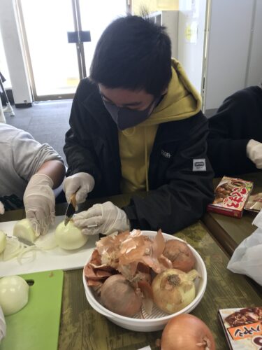 玉ねぎを切る係の子は、目に涙をいっぱいためながら最後まであきらめずにトントン!その頑張りに拍手です。
