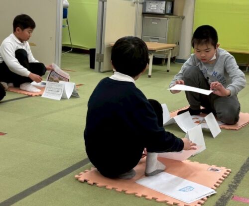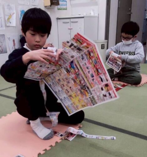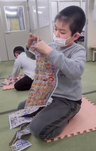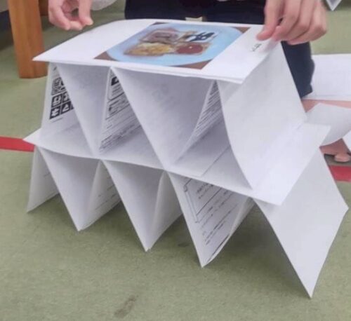 一つ目は紙タワー。半分に折った紙を三角にして組み立てていきます。