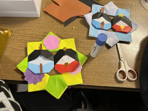 折り紙でおひなさまを折ってリースに貼り付けます