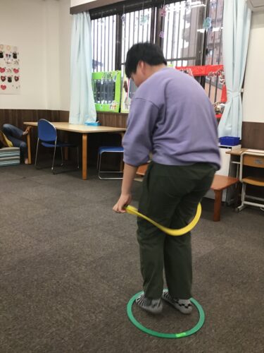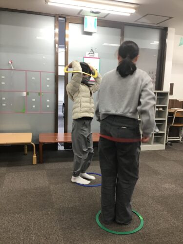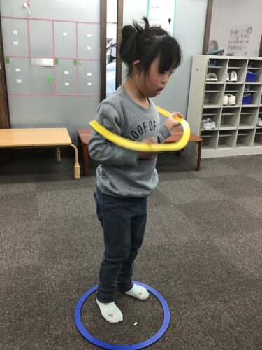 フープを体にくぐらせることで、ボディーイメージを高めていきます。