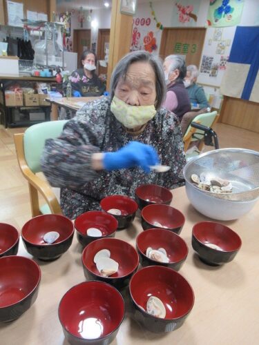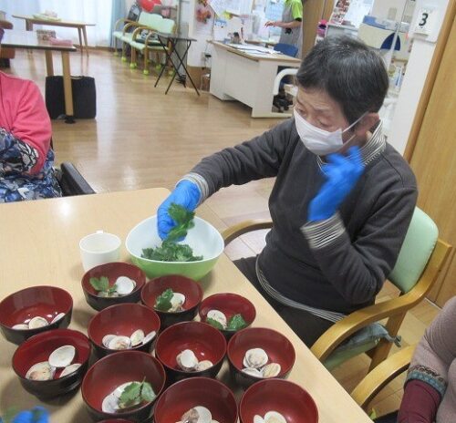 和え物を取り分けて、お椀に蛤を入れて・・・