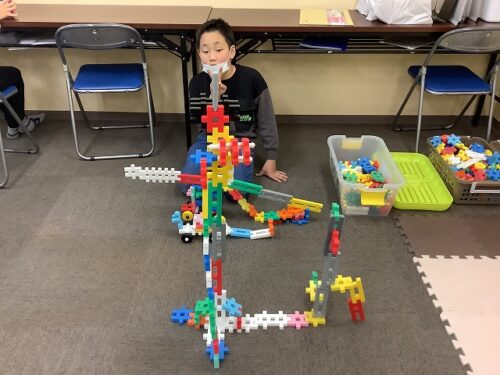 特に目を引いたのは、床いっぱいに広げられた超大作です。 「ここをこう繋げたら倒れないかな?」と試行錯誤しながら、高い塔や複雑な形の乗り物を作り上げていました。 完成した作品を前に、ピースサインで記念写真!✌️ 子どもたちの自由な発想力には、スタッフもいつも驚かされています。