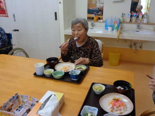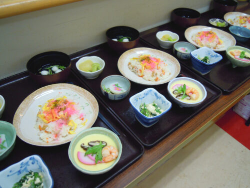 お昼の行事食。メインは彩り綺麗なちらし寿司♪
